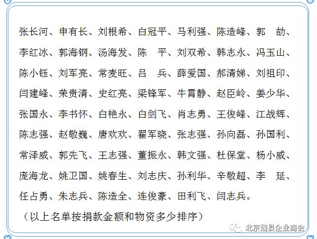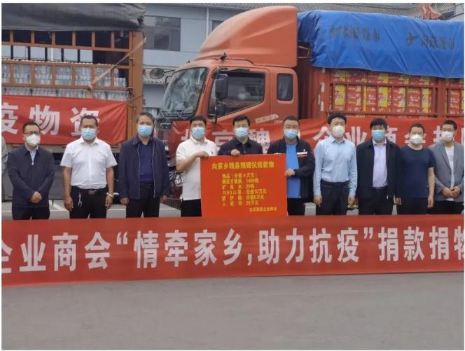 2022年4月26日上午,两辆挂着“北京魏县企业商会捐赠家乡抗疫物资”大红条幅满载抗疫物资的货车驶进了魏州宾馆大院,北京魏县企业商会“情牵家乡,助力抗疫”捐款捐物仪式在这里举行 。魏县政协主席魏志凌 、政府副县长杨帆,县政府办 、政协办、统战部、财政局、工商联、乡村振兴局的负责同志和商会执行会长张长河、常务副会长刘根希、副会长韩志永参加了仪式 。